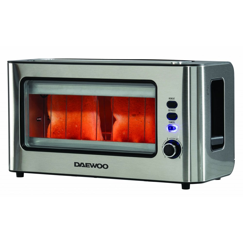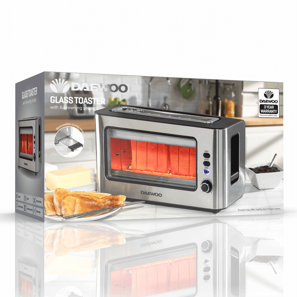 Introducing the Daewoo Two Slice Glass Toaster, featuring a chic, modern design with a clear glass viewing window for practicality and style. Toast 2 slices side by side or one long slice of sourdough in its ultra-wide slot, ensuring even browning.