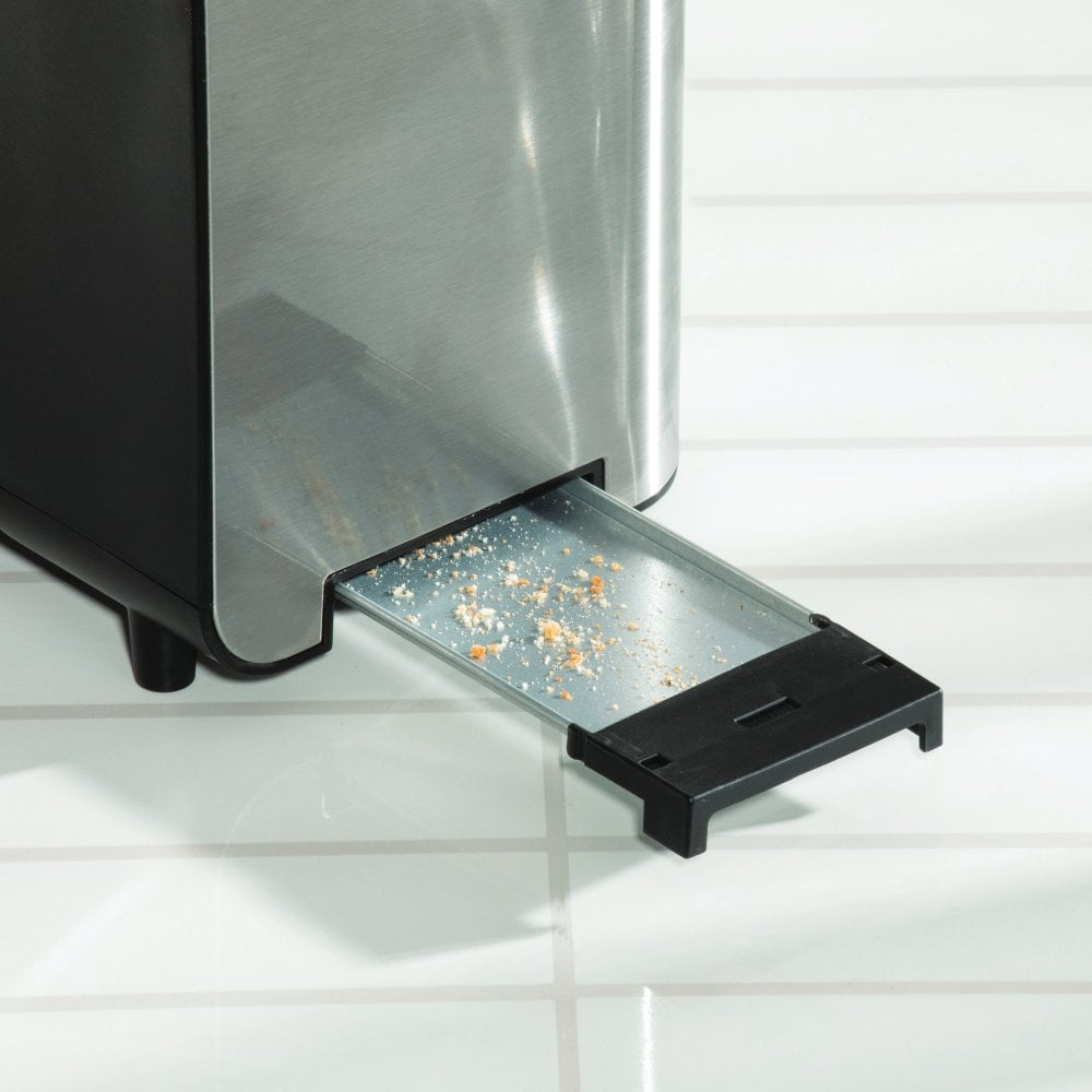 Enjoy 6 browning settings, defrost, and reheating options for versatile toasting. The toaster comes with a sunken high lift lever and an easy-to-empty crumb tray. The removable glass viewing window allows for easy cleaning, keeping the toaster looking crisp and smart.