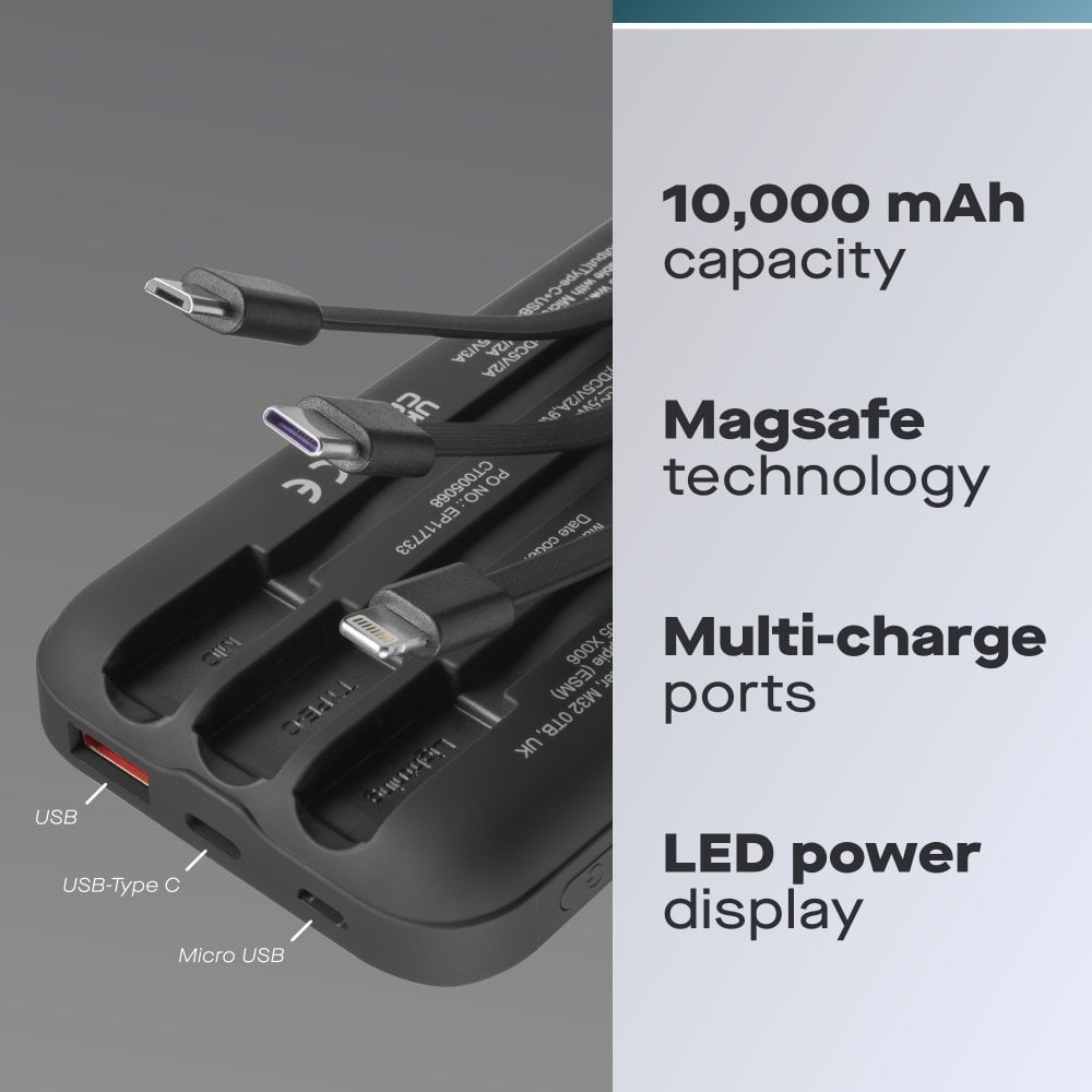 Stay powered up wherever you are with the 10000mAh Portable Power Bank. With its fast charging capabilities, you can charge smartphones, tablets, and other devices quickly and efficiently. This power bank features built-in USB-C, Lightning, and Micro USB cables, making it easy to charge multiple devices simultaneously without the need for extra cables. Plus, its MagSafe and standard Qi wireless charging options give you even more flexibility.